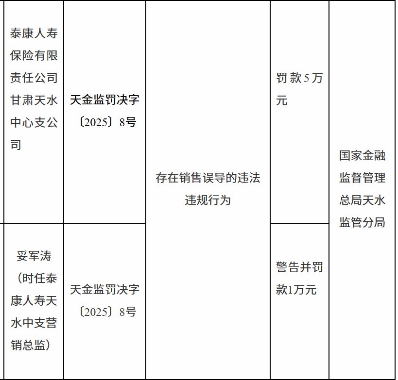 1月5日,国家金融监督管理总局天水监管分局行政处罚信息公开表显示,泰康人寿保险有限责任公司甘肃天水中心支公司因存在销售误导的违法违规行为被罚款5万元,妥某涛被警告并罚款1万元。