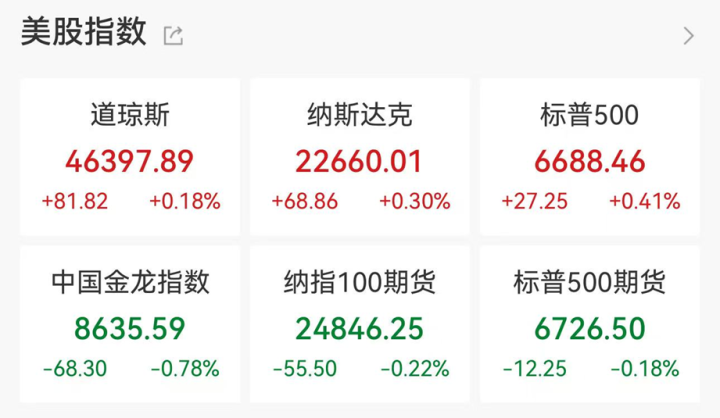 美东时间9月30日周二,美股三大指数集体收涨。截至当日收盘,道琼斯指数涨0.18%,报46397.89点;标普500指数涨0.41%,报6688.46点;纳斯达克综合指数涨0.3%,报22660.01点。
